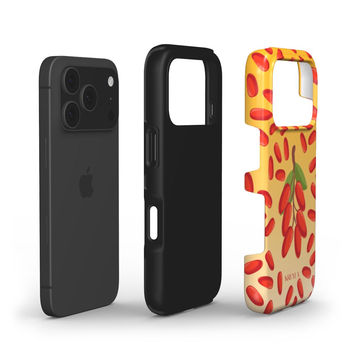 Hand-painted goji berries float across a calming gradient background in warm, glowing tones. Underneath the beauty? A dual-layer shell made from premium materials, sealed in a non-fade glossy finish.